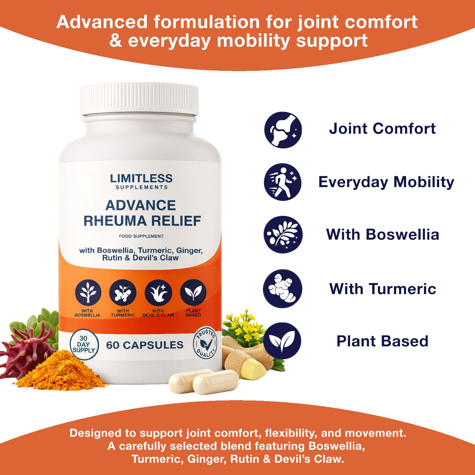 Advance Rheuma Relief is a daily supplement formulated with a blend of botanical extracts, enzymes and supportive compounds — designed to complement your wellness routine.